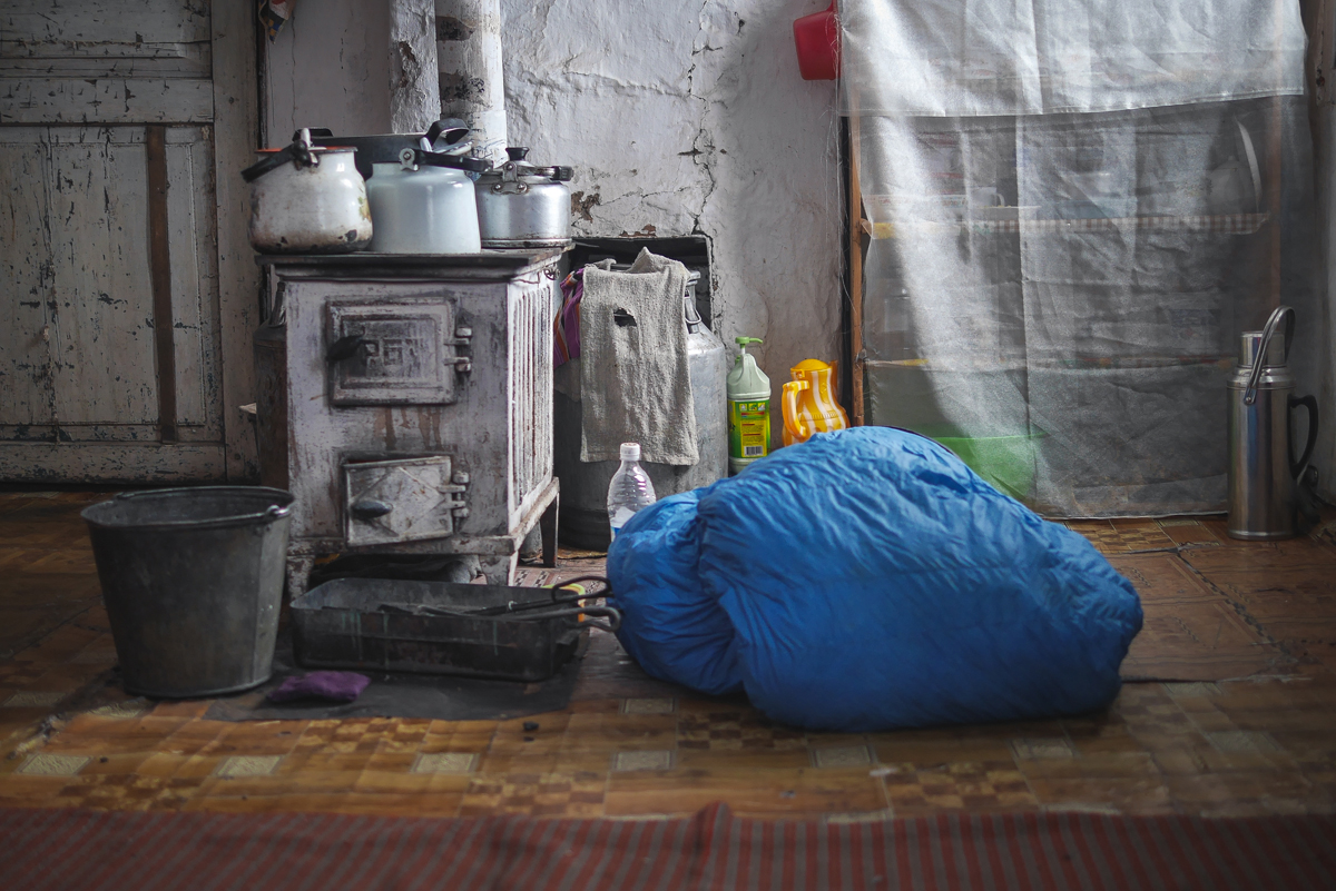 Well, the first night after I’d quit this little village, I had probably the worst night I ever had in the entire journey. It was -20°c, windy, and I was ill all night. Not only was I suffering from cold in the sleeping bag, but I had to rush out every hour in the snow and subzero temperatures… Next morning, I was headed forward, already deprived of sleep, dehydrated, and not very well. I had the next pass in mind. I was thinking if I could reach this one and get into Tajikistan, I’d have reached the plateau, and it would be easier. So I kept on walking and pushing. It took me one day and a half more to reach the summit and pass. And had I not been welcomed by a family in a very improbable house in the middle of nowhere, I’m not sure I’d have continued. This was an intense moment, and I will never forget the evening, night and morning I spent amongst them, sharing meal, smiles and a roof. There was a 4 months old baby, and it was fascinating to see how babies are taken care of here, in beautiful painted wood curbs, covered with thick fabrics so that the baby is in the dark, just like a bird ! It was also wrapped up pretty tight in the sheets.